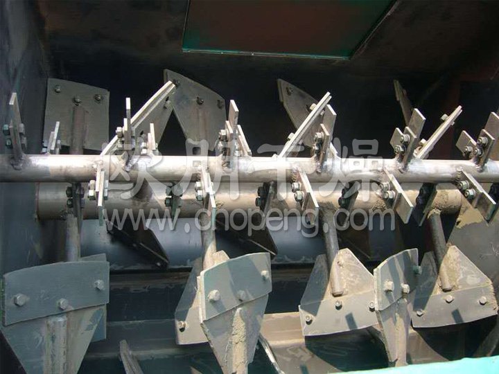 由于槳葉結構特殊,物料在干燥過程中交替受到擠壓和松弛,強化了干燥。干燥室內物料的充滿率很高,可以達到80%~90%,物料的停留時間通過調節加料速度、攪拌軸轉速、物料充滿度等參數可調,從幾分鐘到幾小時內任意調節。另外,物料在干燥機內從加料口向出料口運動基本呈活塞運動,停留時間分布窄,因而產品含水率均勻。槳葉在攪拌軸上有一定的軸向角度,因此可以連續干燥物料。