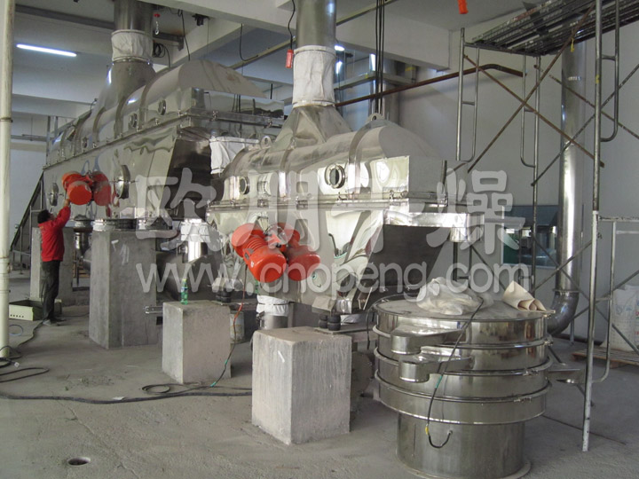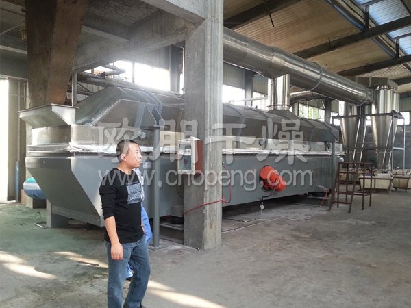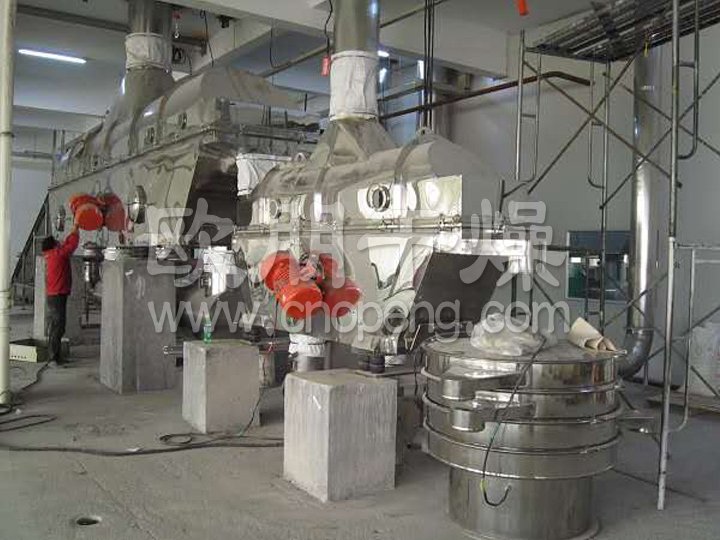 振動流化床干燥器就是將機械振動施加于普通流化床干燥器上。調整振動參數,使返混較嚴重的普通流化床,在連續(xù)操作時得到較理想的活塞流。同時由于振動的導入,使普通流化床干燥器易出現的干燥后顆粒含水率不勻勻,物料含水率稍大時會產生團聚和結塊問題會得到相當大的改善。
